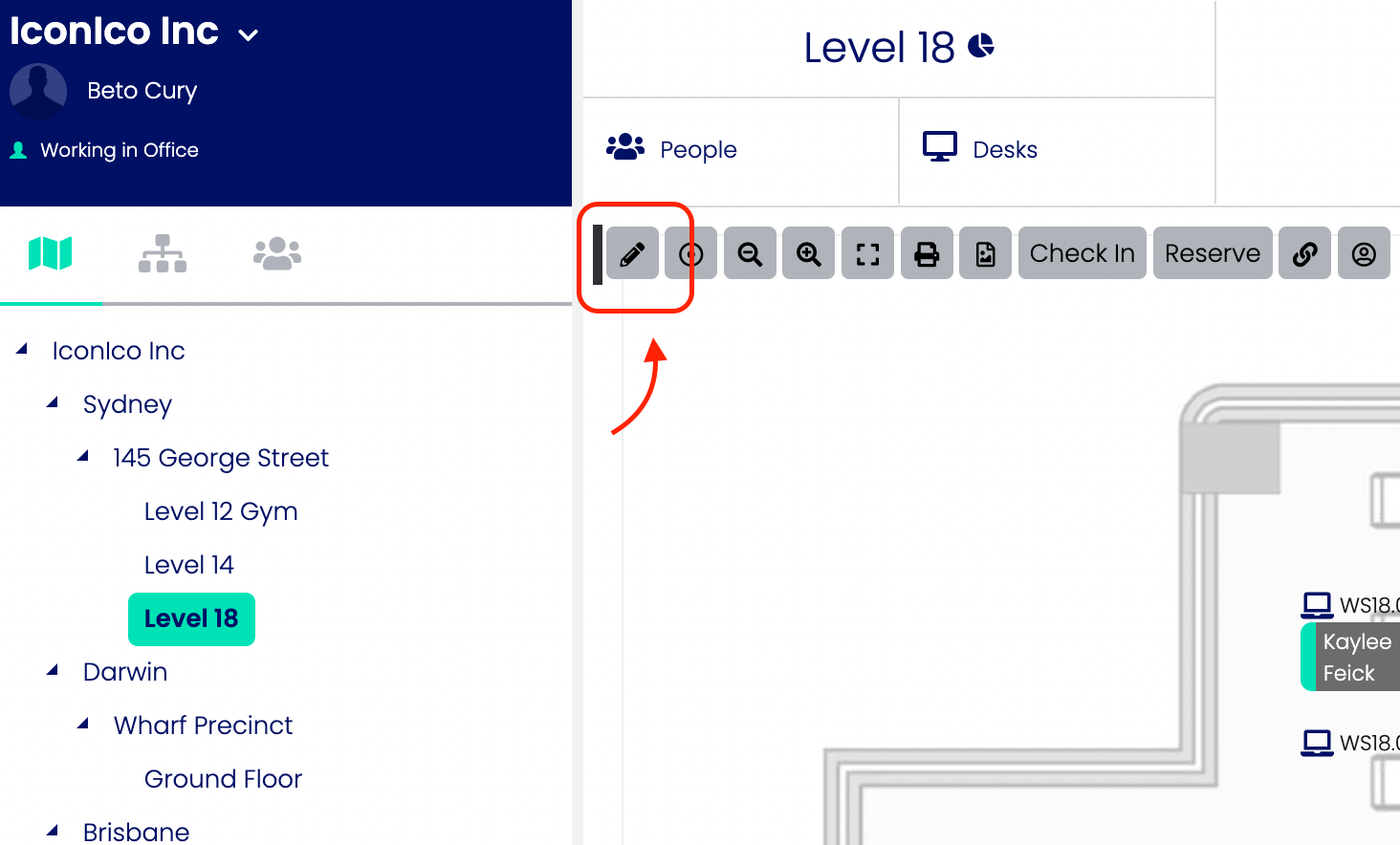 Only Administrators are able to add, edit or remove people from a map. Browse through the Location Tree until the Level location is selected. The pencil button appears next to the map control buttons which are available to all users.